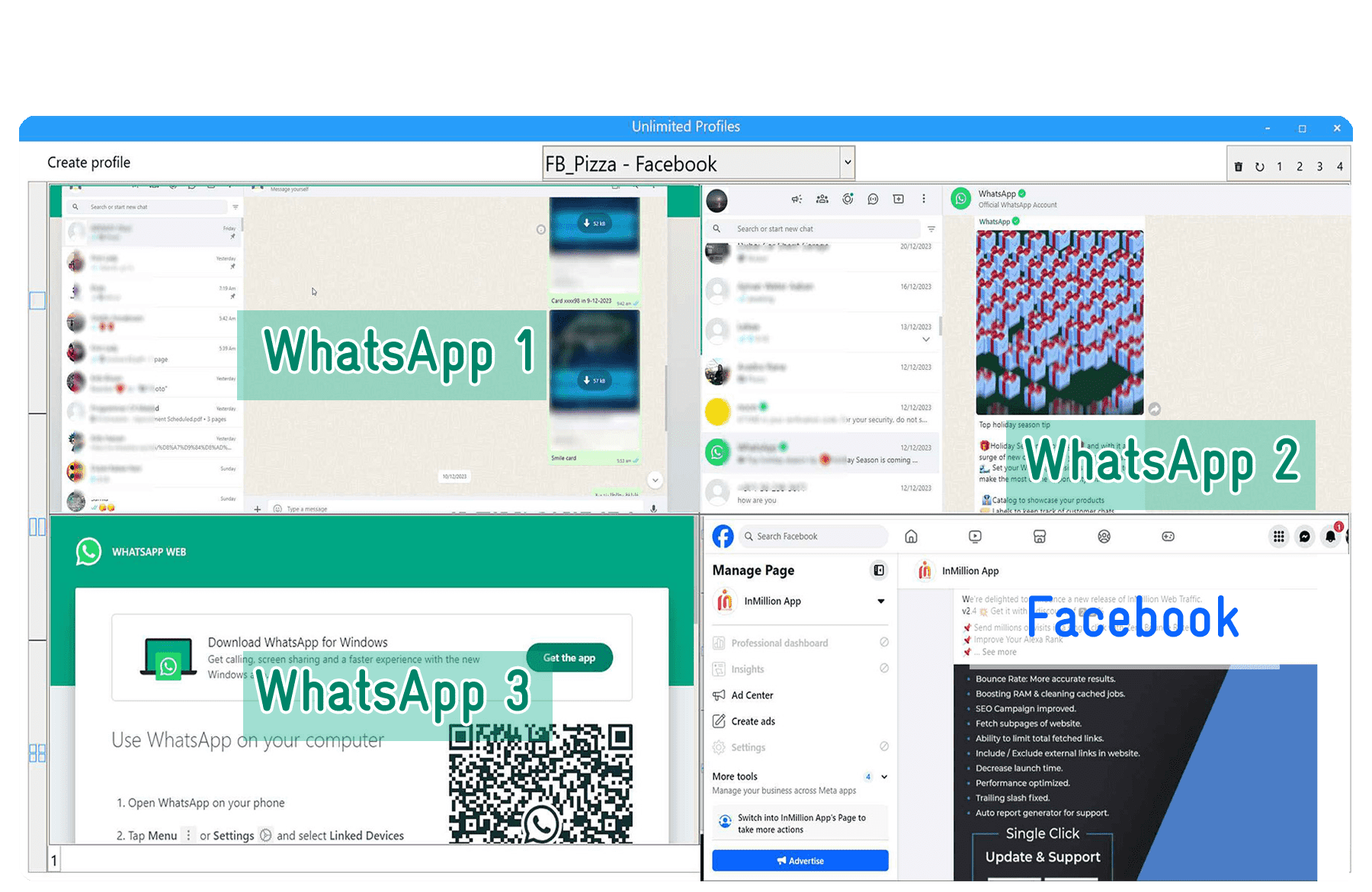 10 WhatsApp accounts, 5 Facebook,